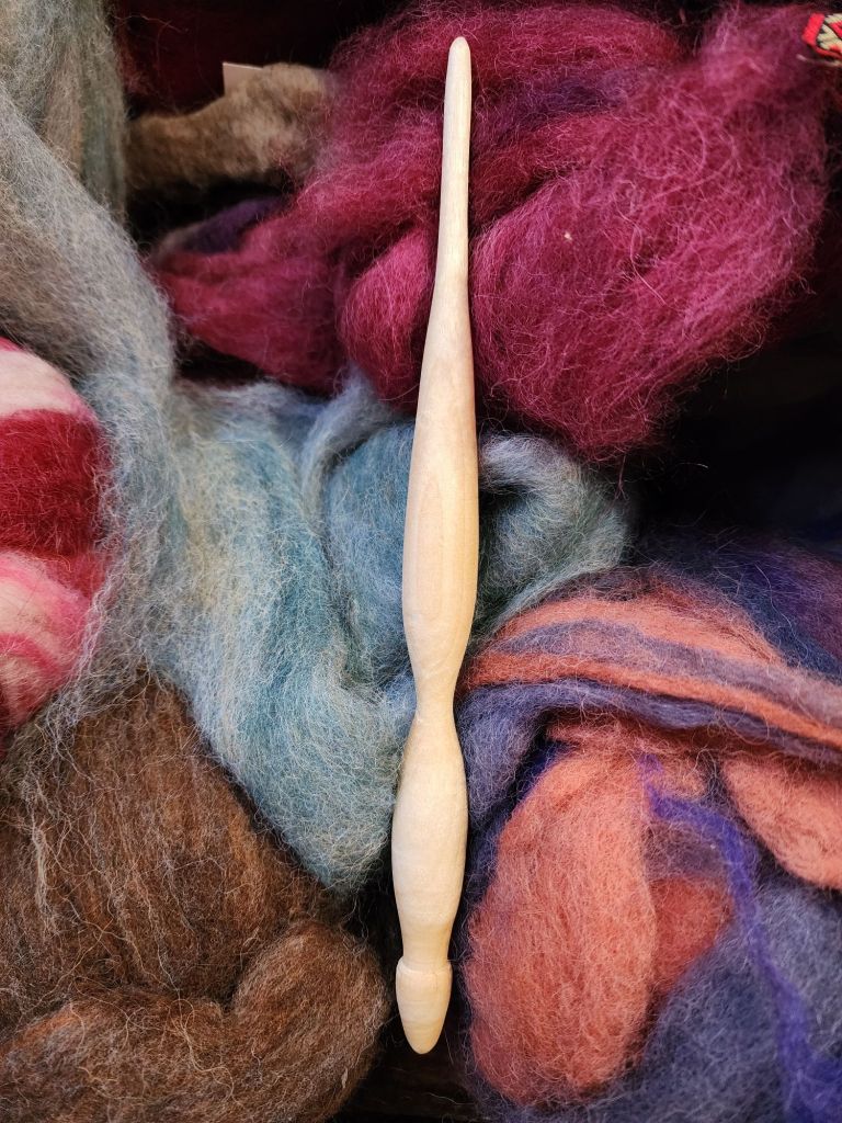 This one is made of oak, and I’ve sold a handful of them with rave reviews. It’s probably the most fun distaff to hold in hand, and it can carry quite a lot of wool!