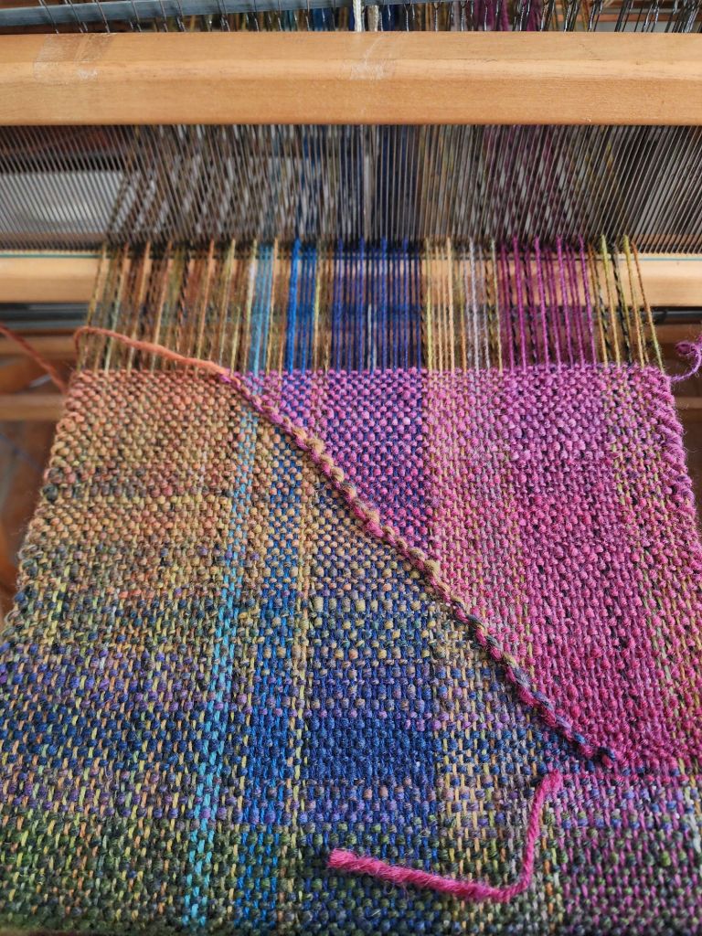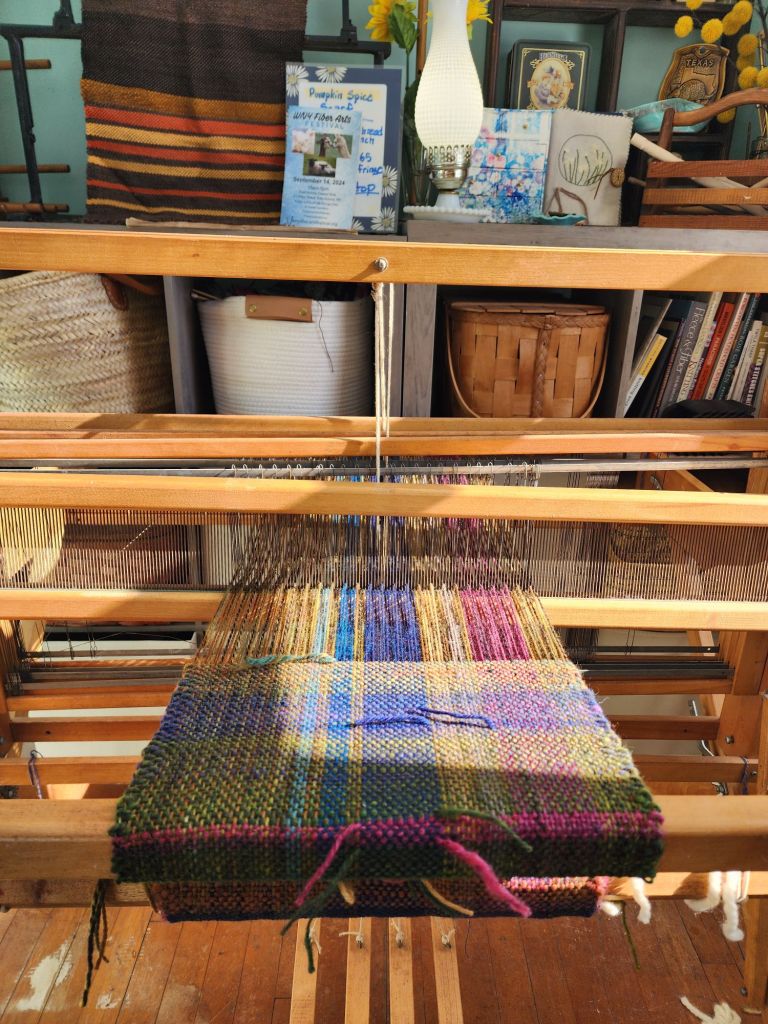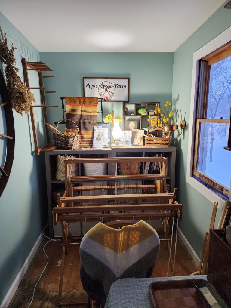 With this goal I am letting go of any thoughts I had of getting to hand dye wool this year. I may have a weekend down the road (especially in goldenrod season) to do a dye pot. But this year of weaving will be using wool other people have dyed, and using up what I have left from years past. I am using my blending board a whole bunch though to make the colors and color combos I want. But it’s a year of setting boundaries!